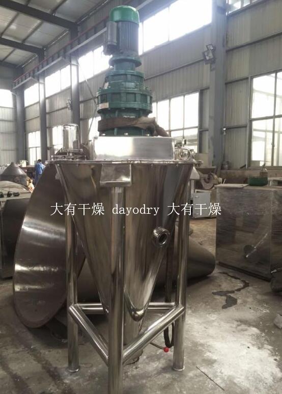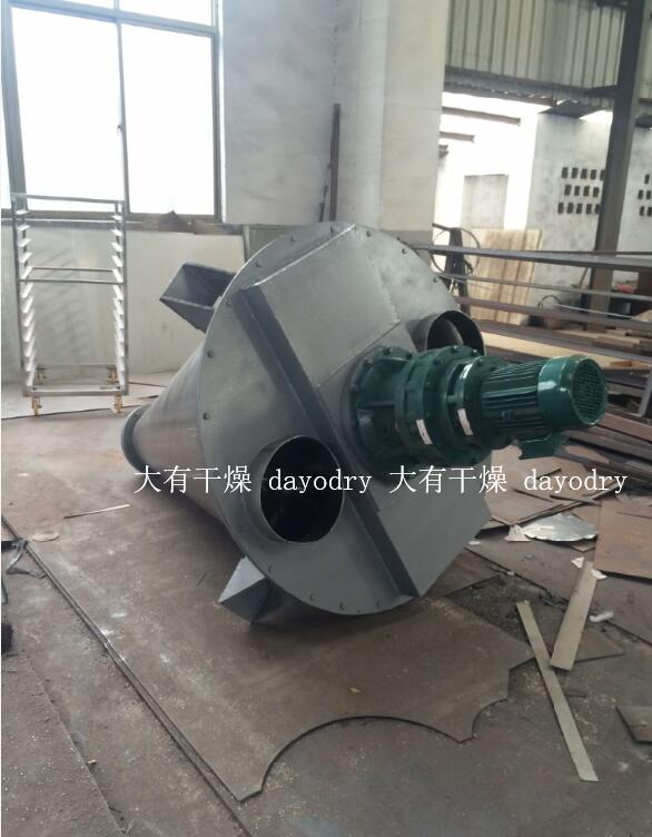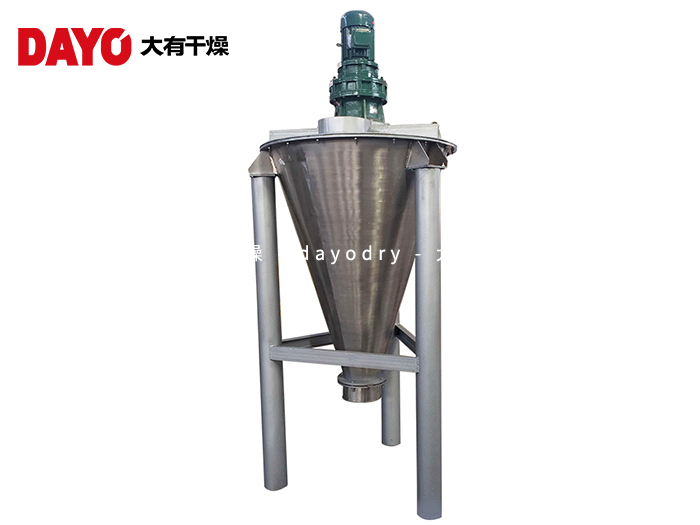 DSH双螺杆混合机由螺旋的公 、自转使物料在锥体内产生复合运动,主要产生四种运动形式: 1. 螺旋沿壁公转,使物料沿锥壁作圆周运动; 2. 螺旋自转使物料自锥底沿螺旋上升; 3. 螺旋的公 、自转复合运动使一部分物料被吸收到螺旋圆柱面内同时受螺旋自转的离心力作用使螺旋圆柱面内的一部分物料向锥体径向排放; 4. 上升的物料受自身重力作用下降 。四种运动在混合机内产生对流、剪切 、扩散、从而达到快速均匀混合的目的。