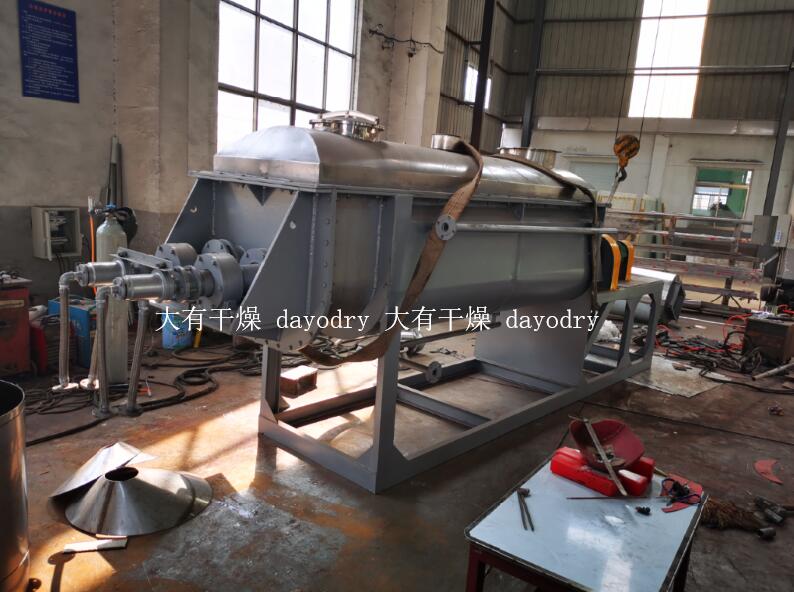 空心轴上密集排列着楔型中空浆叶,热介质经空心轴流经浆叶。单位有效容积内传热面积很大,热介质温度从常温到320℃,可以是水蒸汽,也可以是液体型:如热水、导热油等。间接传导加热,没有携带空气带走热量,热量均用来加热物料。热量损失仅为通过器体保温层向环境的散热。楔型浆叶传热面具有自清洁功能。物料颗粒与楔型面的相对运动产生洗刷作用,能够洗刷掉楔型面上附着物料,使运转中一直保持着清洁的传热面。浆叶干燥机的壳体为Ω型,壳体内一般安排二到四根空心搅拌轴。壳体有密封端盖与上盖,防止物料粉尘外泄而充分发挥作用。传热介质通过旋转接头,流经壳体夹套及空心搅拌轴,空心搅拌轴依据热介质的类型而具有不同的内部结构,以保证理想的传热效果。